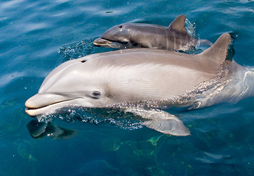 In caring for her calf, a mother dolphin stays close by and attentively directs the calf's movements.