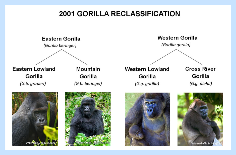 In the past, gorilla scientific classification had one species (gorilla) that was divided into three subspecies. Each of these subspecies was distinguished from one another by their geographic location in Africa.