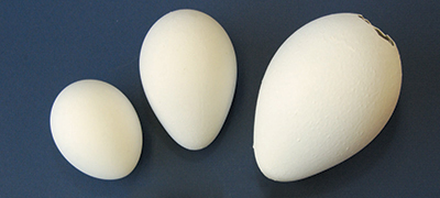 Penguin eggs from left to right: gentoo, king, and emperor.