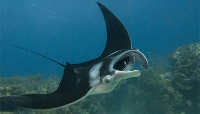 - Rays in the family Mobulidae (Manta spp., for example), the basking shark (Cetorhinus maximus), and the megamouth shark (Megachasma pelagios) strain enormous quantities of plankton from the water on gill rakers. Up to a ton of food has been found in a basking shark's stomach.